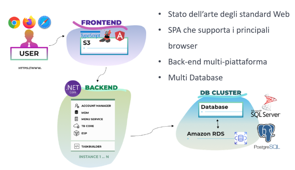 MagoCloud è sviluppato su un'architettura scalabile basata su .NET Core & TaskBuilder BO